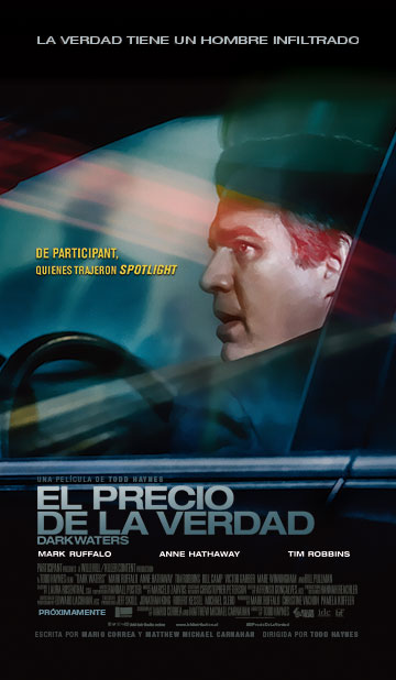 El Precio de la Verdad (Dark Waters) está dirigida por Todd Haynes, a partir de un guión de Mario Correa y Matthew Michael Carnahan. Está protagonizada por Mark Ruffalo, Anne Hathaway, Tim Robbins, Victor Garber, Mare Winningham, William Jackson Harper y Bill y está Inspirada en una historia real, la película se centra en la figura de Robert Bilott, quien tras ejercer durante ocho años como abogado corporativo cambió de bando para enfrentarse en los juzgados a la todopoderosa multinacional DuPont Corporation por sus prácticas poco respetuosas con el medio ambiente. En el proceso arriesgó todo, su futuro, su familia y su propia vida, para exponer la verdad.